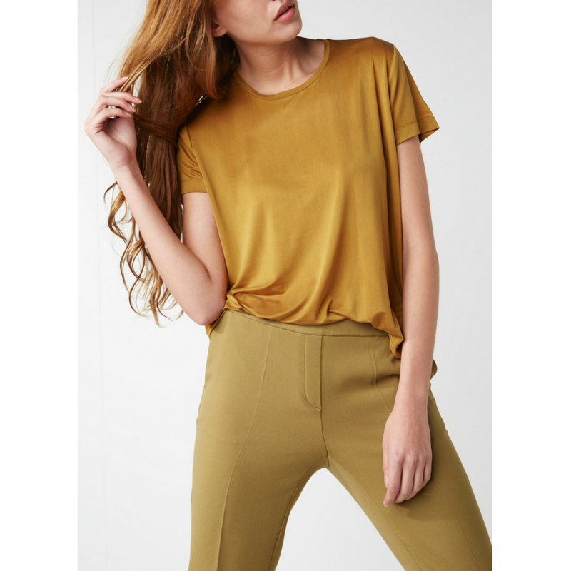 This mustard colored shirt is made of cupro and has a straight and loose silhouette