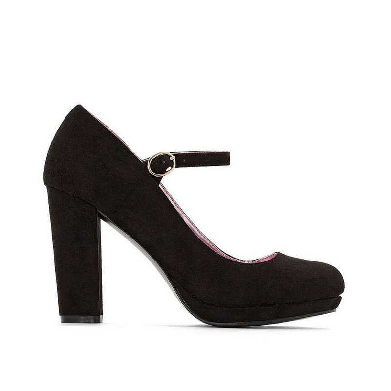 Black pumps with a wide heel of 10 cm. Suède finish.