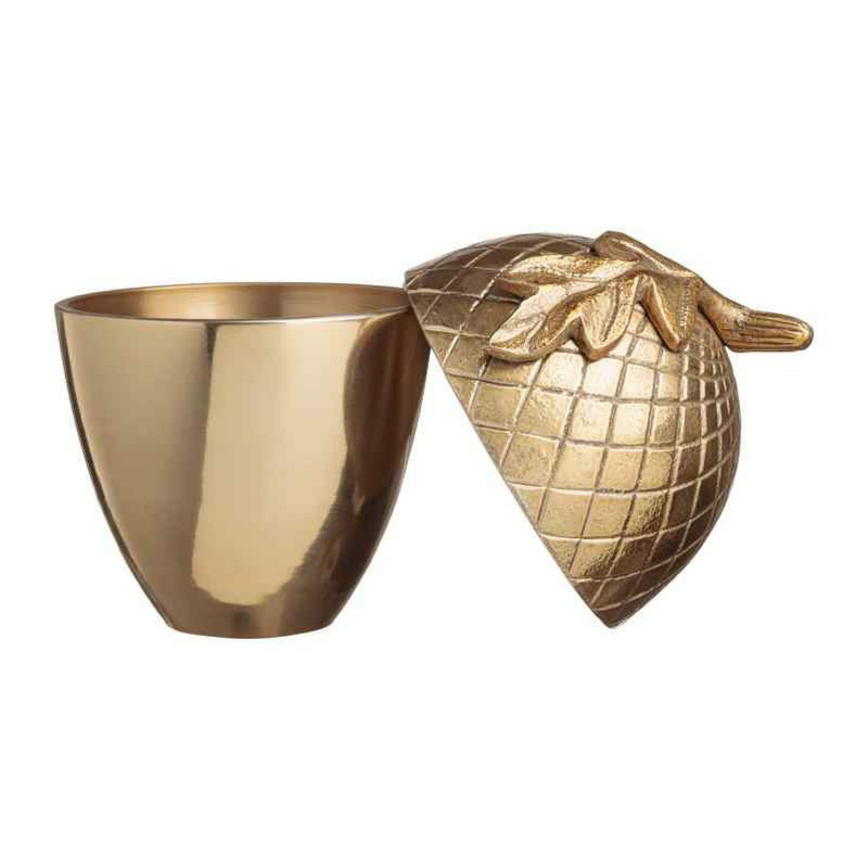 Een ovale metalen pot met een deksel met een eikenbladvormige versiering. Diameter op het breedste punt ca. 8,5 cm. Hoogte 15 cm.