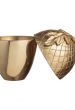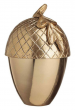 Een ovale metalen pot met een deksel met een eikenbladvormige versiering. Diameter op het breedste punt ca. 8,5 cm. Hoogte 15 cm.