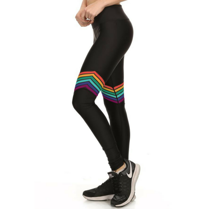 Deze legging met regenboogprint is gemaakt van vocht absorberende stof die erovor zorgt dat je droog en comfortabel blijft tijdens het sporten. De heupband is elastisch.