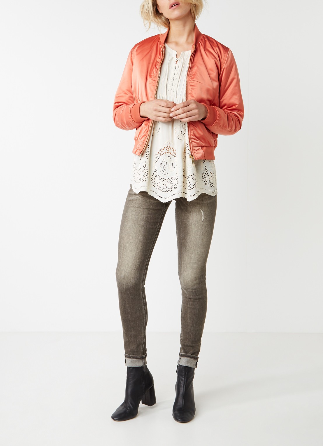 Gevoerd bomberjack Lady Luck van Amsterdams Blauw, uitgevoerd in satijn. Het jack sluit met een goudkleurige rits en is aan de voorzijde voorzien van twee klepzakken met drukknoopsluiting.