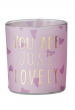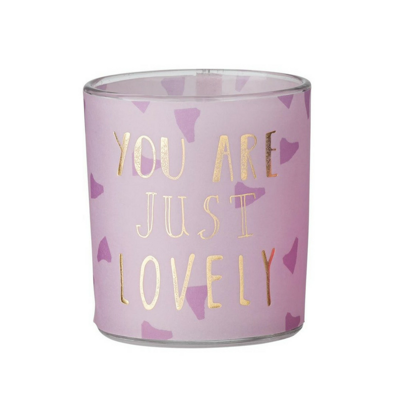 Een roze glazen sfeerlichthouder met driehoekjes en in het goud de tekst ‘you are just lovely’. Deze sfeerlichthouder is bestemd voor kleine waxinelichtjes.